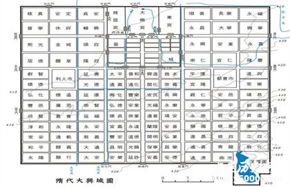 开皇二年(582)正月,命宇文恺负责设计建造新城-大兴城,翌年三月竣工。宇文恺参照北魏洛阳城和东魏、北齐邺都南城,把龙首原以南的6条高坡视为乾之六爻,并以此为核心,作为长安城总体规划的地理基础。