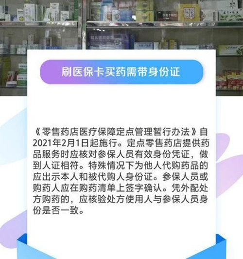 《零售药店医疗保障定点管理暂行办法》自2021年2月1日起施行。定点零售药店提供药品服务时应核对参保人员有效身份凭证,做到人证相符。特殊情况下为他人代购药品的应出示本人和被代购人身份证。参保人员或购药人应在购药清单上签字确认。凭外配处方购药的,应核验处方使用人与参保人员身份是否一致。