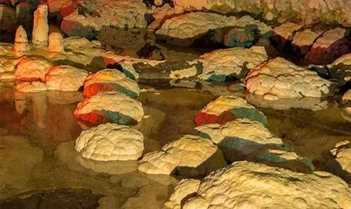 月奶石景观是—种乳白色、含水分高、可塑性、无定形的浆糊状或粉末状的碳酸盐沉积物构成的景观。月奶石早在15世纪已在瑞士为人们所发现。其组成矿物成分复杂,主要是方解石和文石,有时还有含水菱镁矿、碳酸钙镁矿、菱镁矿、三水菱镁矿、白云石等。