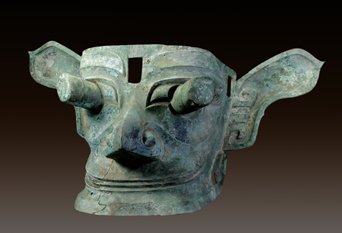 鼻翼两侧铸成有美感形式的云状,这是这个造像最出色的地方。这尊造像有祭祀的戏剧感以及形式美观,使造像富有了艺术气息。面具的耳朵也非写实的耳朵,上翘,同突出的眼睛像呼应,耳朵里面转折弯曲的地方铸造者也用了形式代替真实,有钩型纹,这是中国古代常用的一种形式。