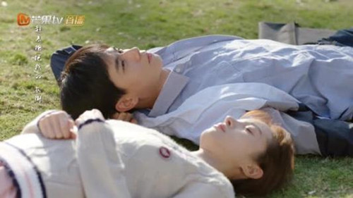 相约的两个人都找到了彼此,他们一起躺在草坪上,他们没有并肩躺着,而是头抵头的躺着。