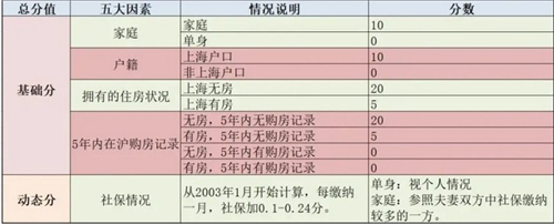 其中,家庭、户籍、购房人拥有的住房状况、5年内在沪购房记录4大因素各自拥有基本分。如果购房者全部满足四大因素,也就是本市户籍、家庭、无房、5年内无交易,那么最高可以得60分。而在沪缴纳社保则从2003年1月开始计算,每缴纳一个月社保加0.1分。按照今天新开的新盘情况,社保(2003.1-2020.2)最多可以增加21.7分。